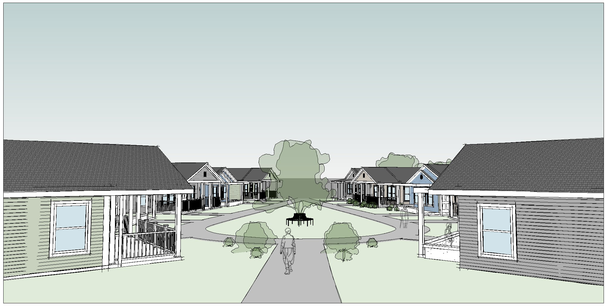 The homes are arranged with front porches facing other front porches.