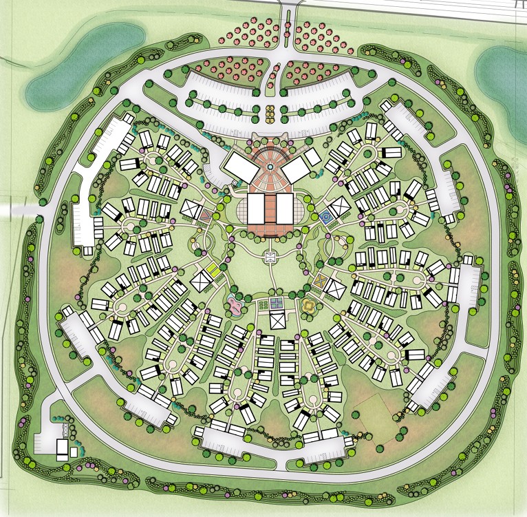A gym, a spa, a grocery store, a farmer’s market, hobby spaces, village golf carts, on-site care and support staff, walking paths, and in Phase II a restaurant open to the public.