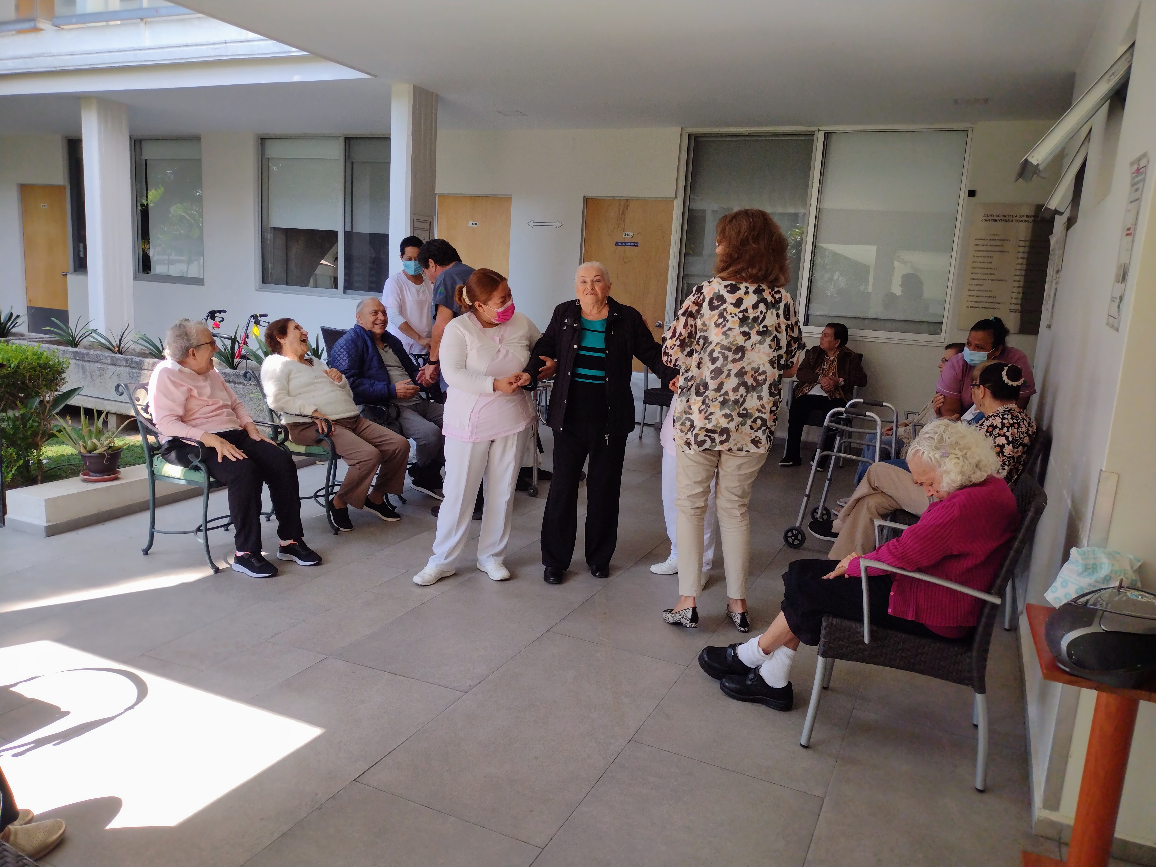 Photo of rehabilitation patio with Dr. Golub greeting residents, and Director Gonzalez in black and beige blouse dancing in front of a resident